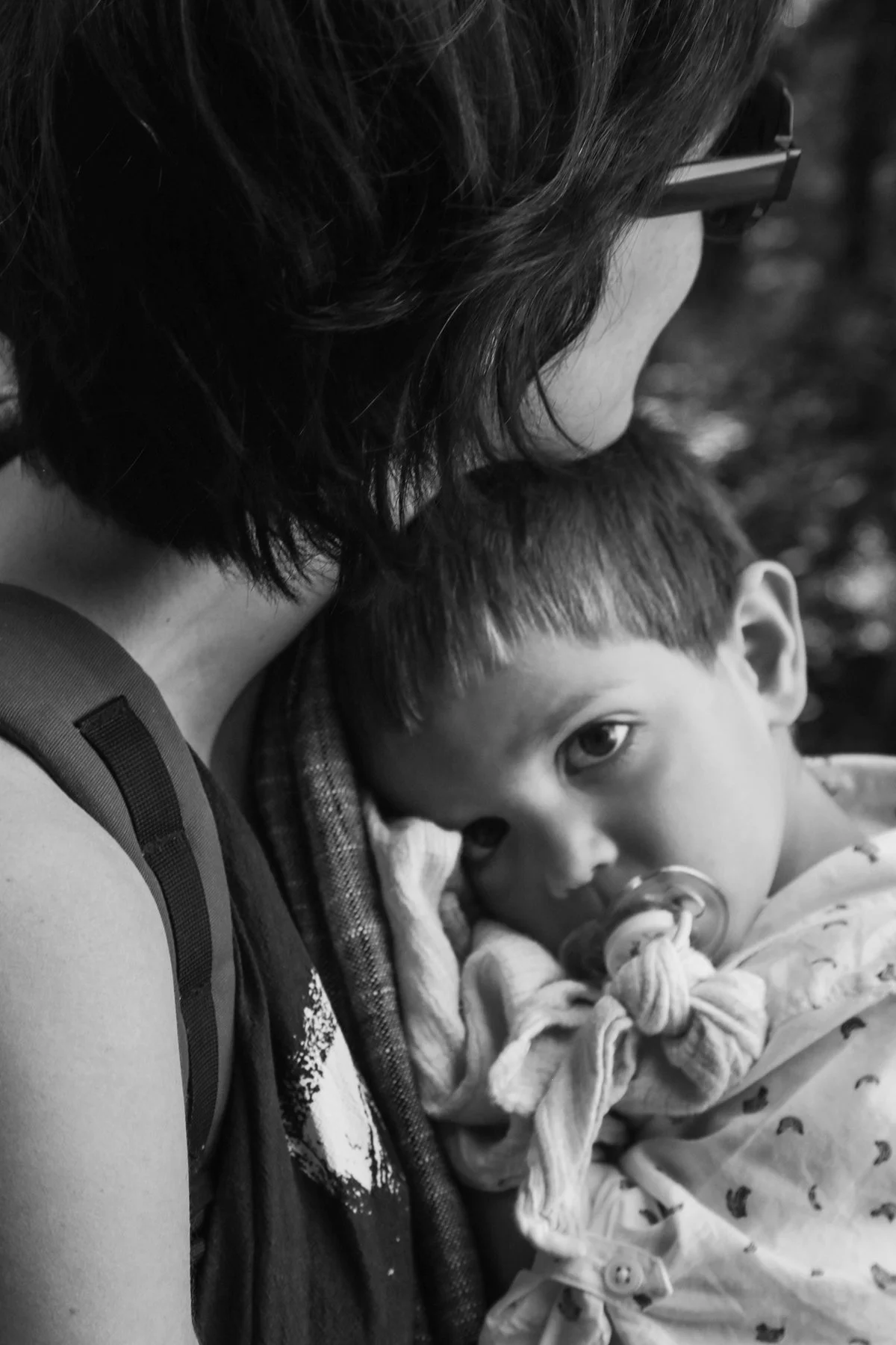 A boy (nearly too tall to be using mom as a chair) curls into her with the urgency, still needing the reassurance of that space. A photographer presses the shutter.